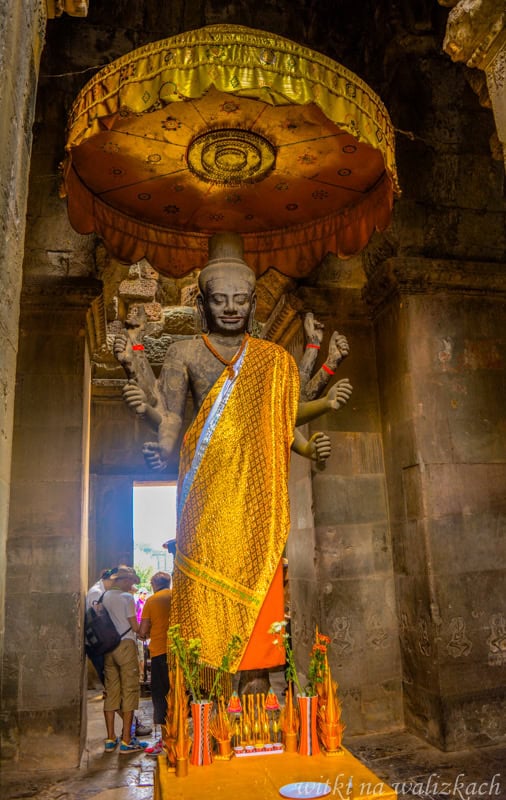 Jest to oczywiście najpopularniejsza świątynia, co powoduje, że czasami trzeba odstać swoje w kolejce do schodów prowadzących na wyższe tarasy. Podczas zwiedzania Angkor Wat przez chwilę poczuliśmy się jak celebryci. W pewnym momencie zaczepiła nas chińska wycieczka pokazując wymownie na aparat. Początkowo myśleliśmy, że chcą żebyśmy zrobili im zdjęcie na tle świątyni ale po chwili okazało się, że to nie arcydzieło khmerskiej architektury jest tu największą atrakcją, a skromna para turystów z Polski 🙂 Wszyscy chcieli zrobić sobie z nami zdjęcie, jak widać w innych rejonach świata to europejczycy są egzotyczną atrakcją.