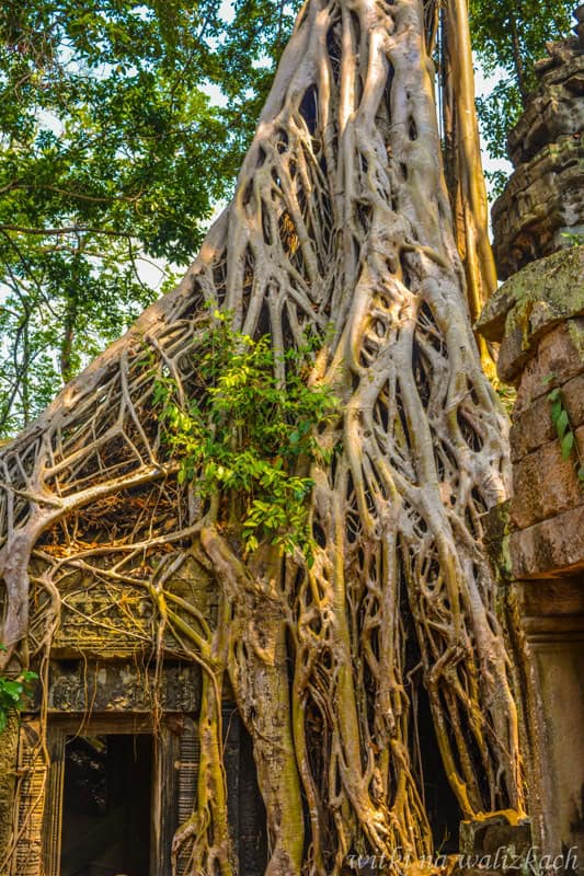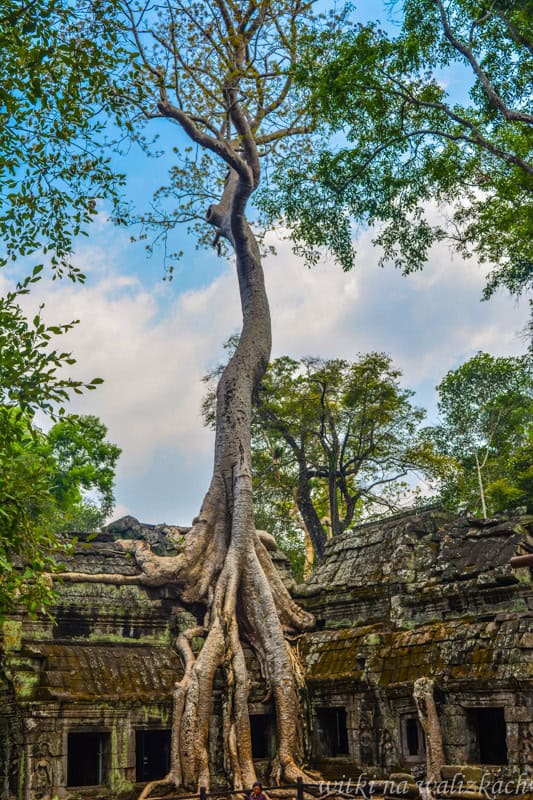 Kolejną świątynią, której nie można ominąć jest Ta Prohm. Świątynia, która została rozsławiona dzięki filmowi Tomb Raider, jest jedną z najpopularniejszych w całym kompleksie. Różni się od pozostałych tym, że nie została całkiem wydarta dżungli. Dzięki temu możemy sobie wyobrazić jak wyglądała pozostawała część Angkoru, gdy została ponownie odkryta dla współczesnego świata. Na terenie świątyni pozostawiono drzewa, które swoimi korzeniami oplatają stare mury tworząc z nimi jedność.