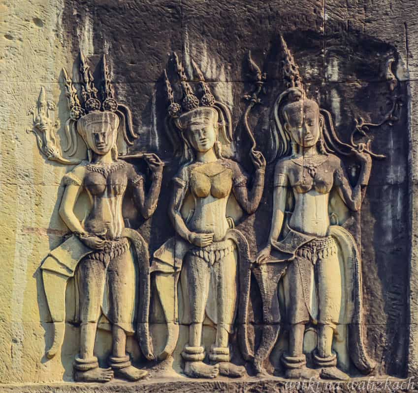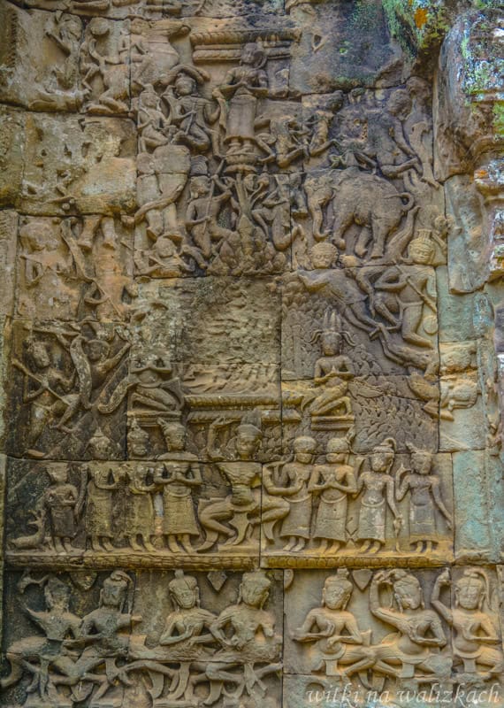 Oprócz charakterystycznych, strzelistych wież, które widać już z daleka ważnym elementem świątyni są tak zwane kamienne arrasy czyli płaskorzeźby zdobiące mury świątyni. Ciągną się na długości 900 metrów i podobno przedstawiają ponad 20 tysięcy postaci. Pokazują one sceny życia króla i dwory oraz z eposów Ramajany i Mahabharaty. Są one wszechobecne w miejscowej kulturze i sztuce w tych rejonach Azji, o czy piszemy też w naszych relacjach z Indonezji.